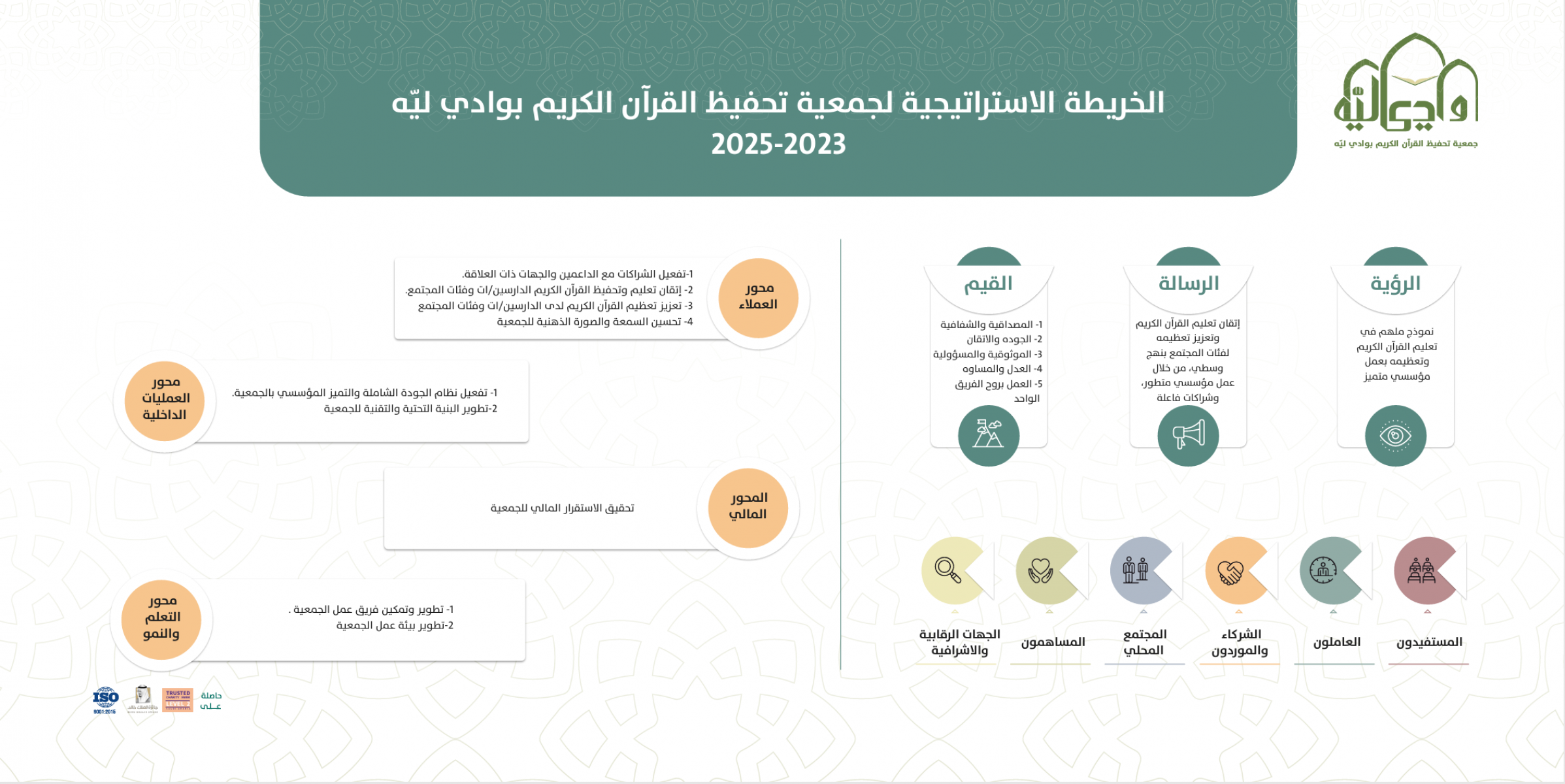 تقدم الجمعية خدمة تعليم القرآن الكريم لجميع فئات المجتمع ذكور واناث، صغار وكبار، حيث وصلت عدد البرامج التعليمية أكثر من 10 برامج، والتي تقدمها من خلال نطاقها الجغرافي المعتمد في اللائحة الأساسية وهو منطقة مكة المكرمة، ويقع مقر الجمعية في وادي ليه جنوب محافظة الطائف.